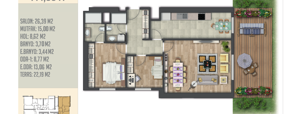 There are 2785 residences (1+1, 2+1 and 3+1), including 102 shops, in the complex.